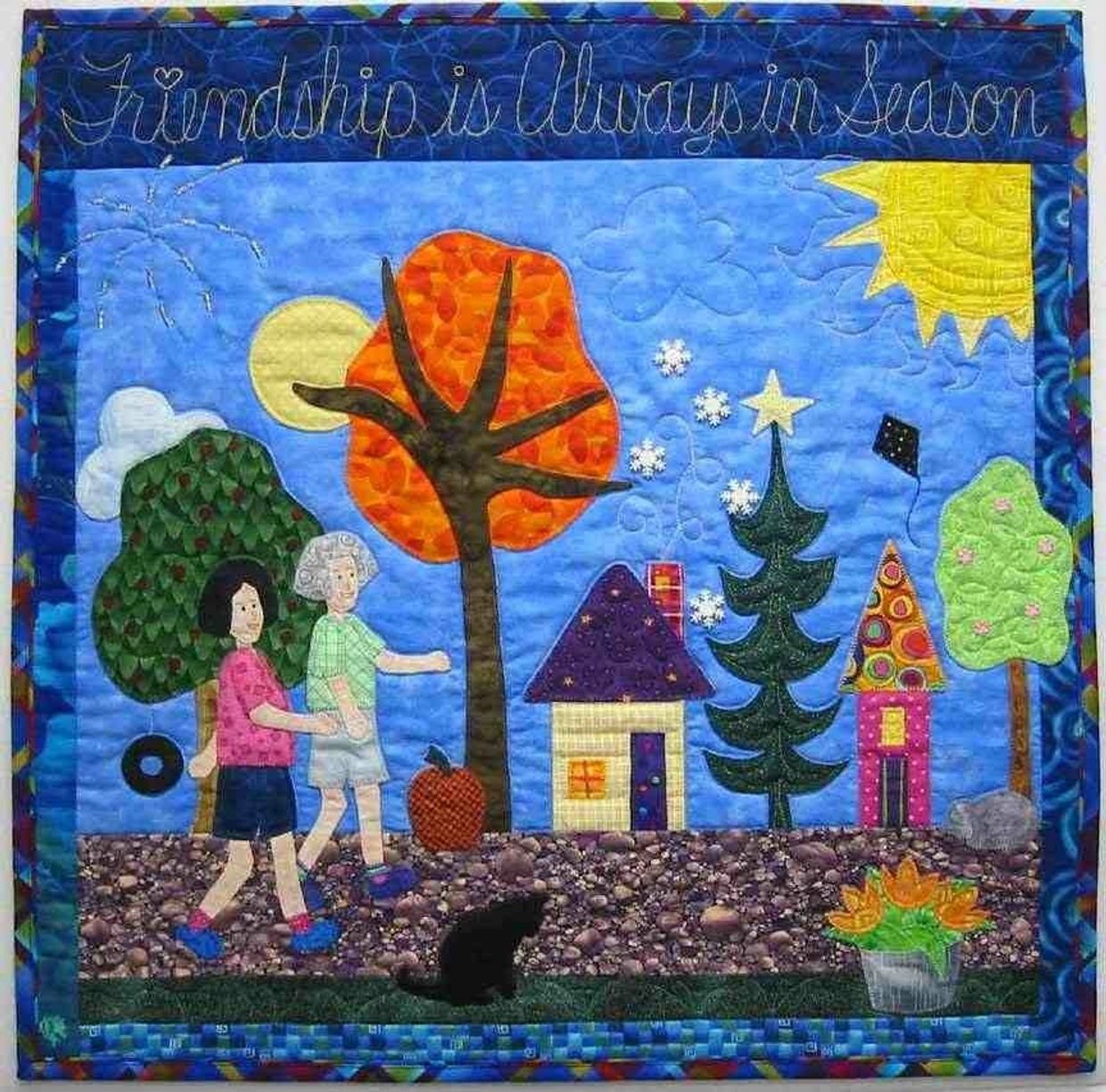 This quilt tells the story of my friendship with TyeAnn. We met at our neighborhood's school bus stop on our older children's first day of kindergarten in 1983. We each had a toddler in a stroller. We walked around the block together that day and have been doing it ever since! We have walked through all seasons of the year, and the seasons of our lives.
