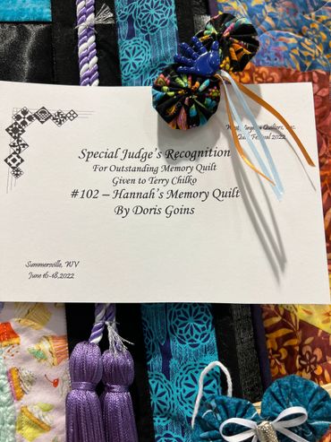 The quilt won the 2nd place Viewers Choice award at the Country Roads Quilt Guild’s Quilt Show during WVU’s Mountaineer Week, 2005, in Morgantown, WV.