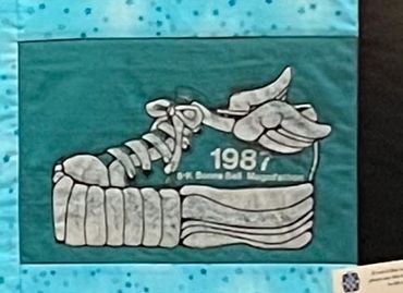 Everything in the quilt is meaningful. Her computer screen always shows a photo of her nieces or nephew, she loves black eyed Susans, iced tea and rollerblading. The little chick that sits on her computer was a gift from another coworker and the "SSS" on the soles of her shoes stands for "Sexy Sensible Shoes," (a long story). A photo hangs above her desk of us on a boat in the Seattle harbor on a free day of a business trip we took together. "Cyberqueen" was her nickname at the time and is embroidered on the crown (the crown fabric was left over from my daughter's prom gown!) The star blocks in the top corners are the "Friendship Star" and "Perpetual Motion" (which describes her perfectly!) The bottom border represents her love of the outdoors. The tree blocks are connected by "firefly" quilting. A thought bubble comes from under the desk to a photo of her husband from their wedding day. The wave quilting in the left border is another reminder of our fun in Seattle. This was a gift for her 30th birthday. I used her favorite colors (blue and green) and a little of my favorite (purple) to make a special quilt. I think of this quilt as a snapshot that celebrates this time in her life.